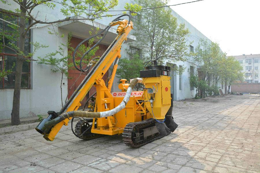 该系列履带式潜孔钻机主要用于露天矿山及石方工程钻凿下向倾斜爆破孔作业。该钻机采用内燃机(或电动机)油泵组为动力,液压马达行走、回转,液压马达链条推进及提升,油缸摆角定位,传动结构简单,易损件少,耗气量低。
